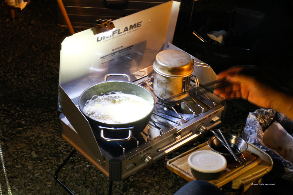 先生每次露營都想弄成居酒屋,一直說想掛居酒屋燈籠…><。森林裡滿山的螢火蟲,聽著唱歌般滋滋輕巧的油炸聲,一道一道現炸現吃,佐著蘸醬極美味,彷彿是高級天婦羅居酒屋營業中…。