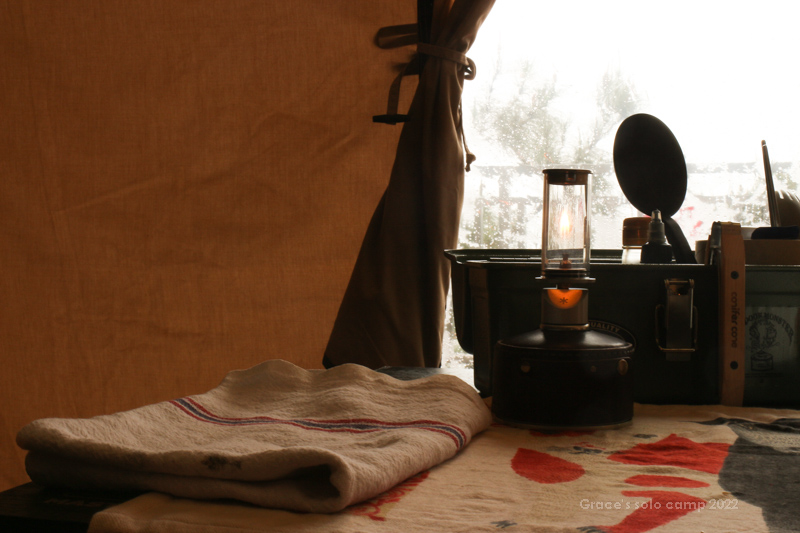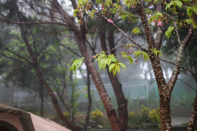 這天有四帳,兩帳是很大沙色與白色隧道帳,透著光很溫暖,露友們很安靜,隔壁帳是一對老夫妻,搭明亮寶藍色的傳統客廳帳,老先生隔著欄杆跟我聊露營故事,很自在。營區沒有收訊,寒流下著雨,是難得的靜謐氛圍…。