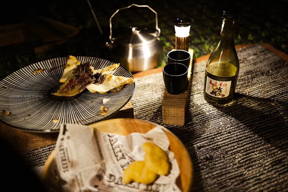19:00 帳篷內升柴爐(此行給先生的亮點),喝小酒,外帶營區的牛肉辣椒薄餅、松露薯條,溫暖夜晚…。
