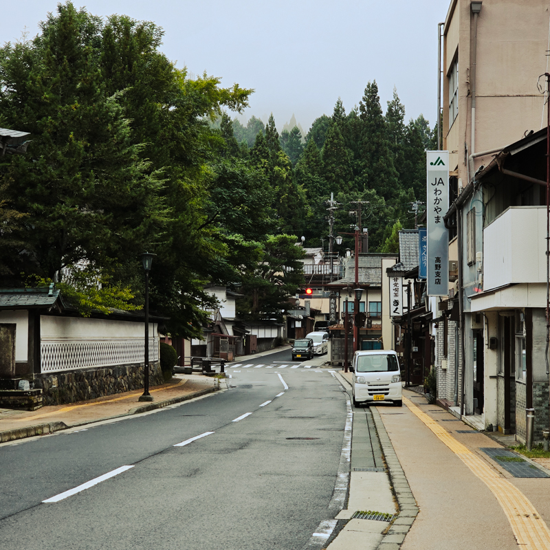 順著街道緩步而行,路標清楚,石街潔淨。「金剛峯寺」在雨霧中,美得動人。